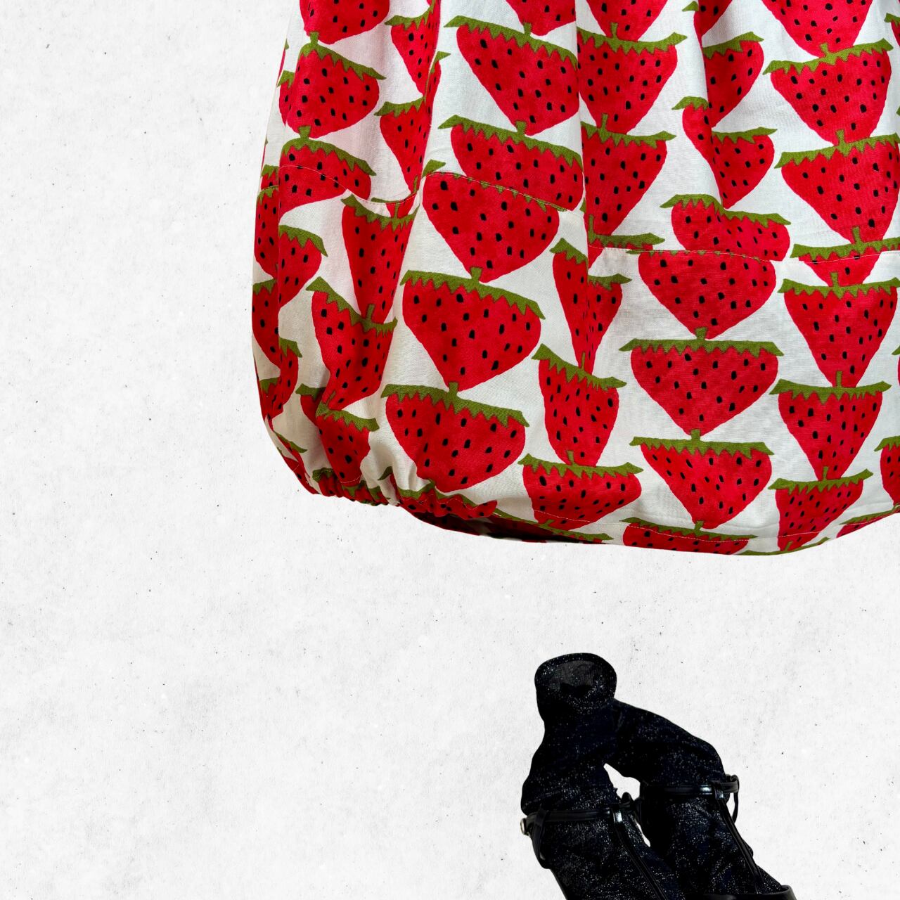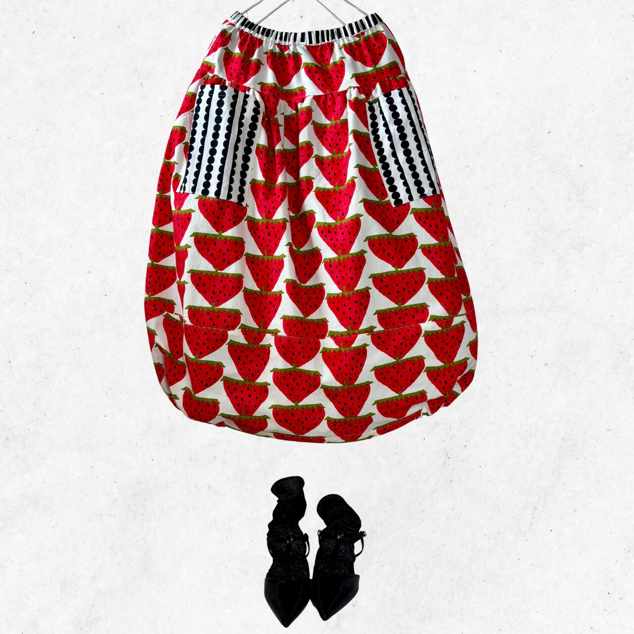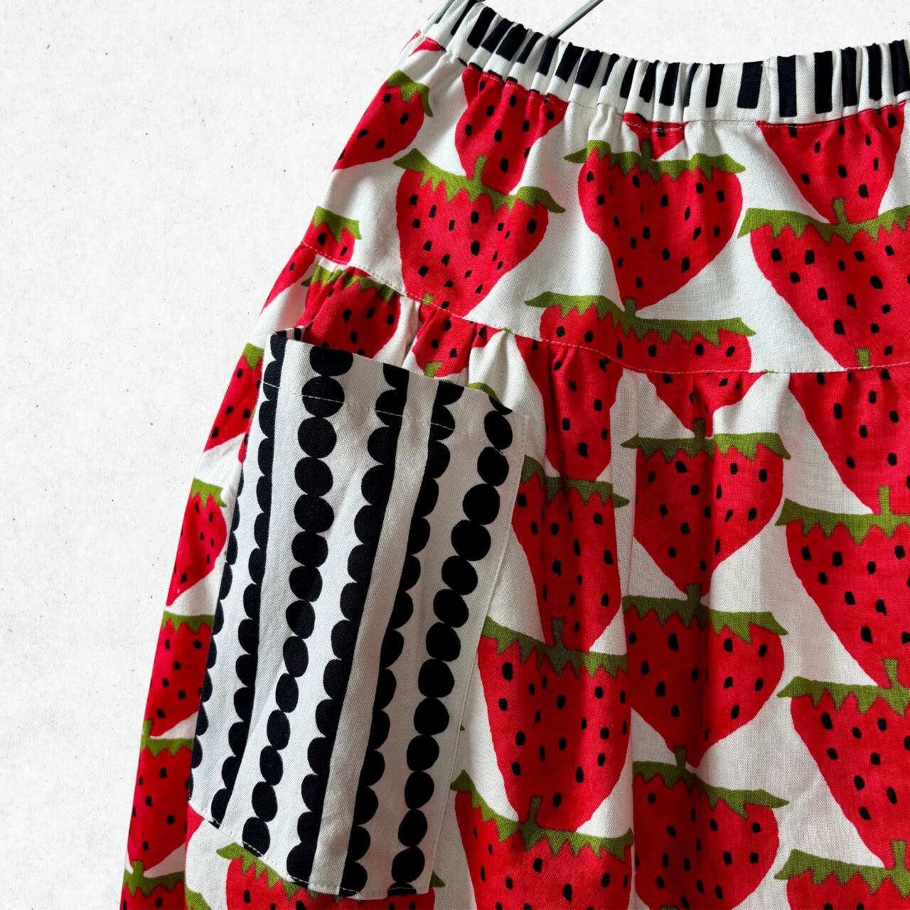 白地に映える真っ赤ないちご柄が可愛らしい、コットンキャンバス生地のスカートです。