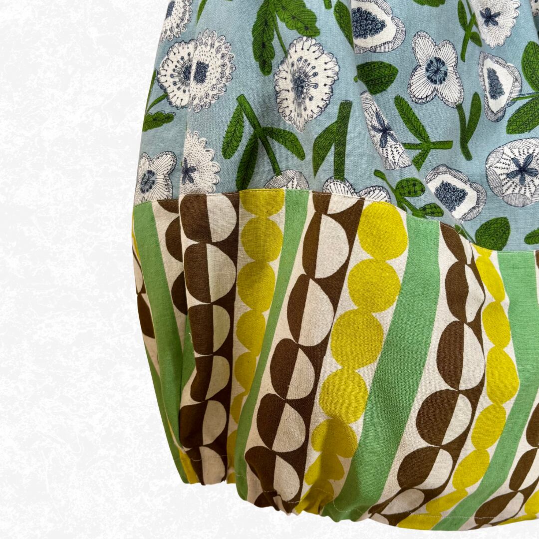 ブルー線画のお花(サックス地)と、コインドットストライプ(コットンリネン)を組み合わせたスカートです。