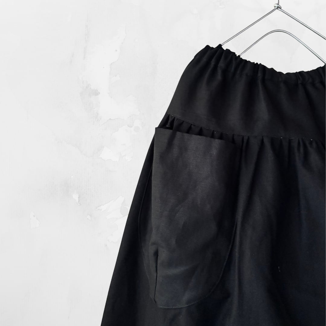 生地はしっかりしたオックス。深みのある黒です。ポケットと切り替え部分は光沢のあるコットンリネンです。