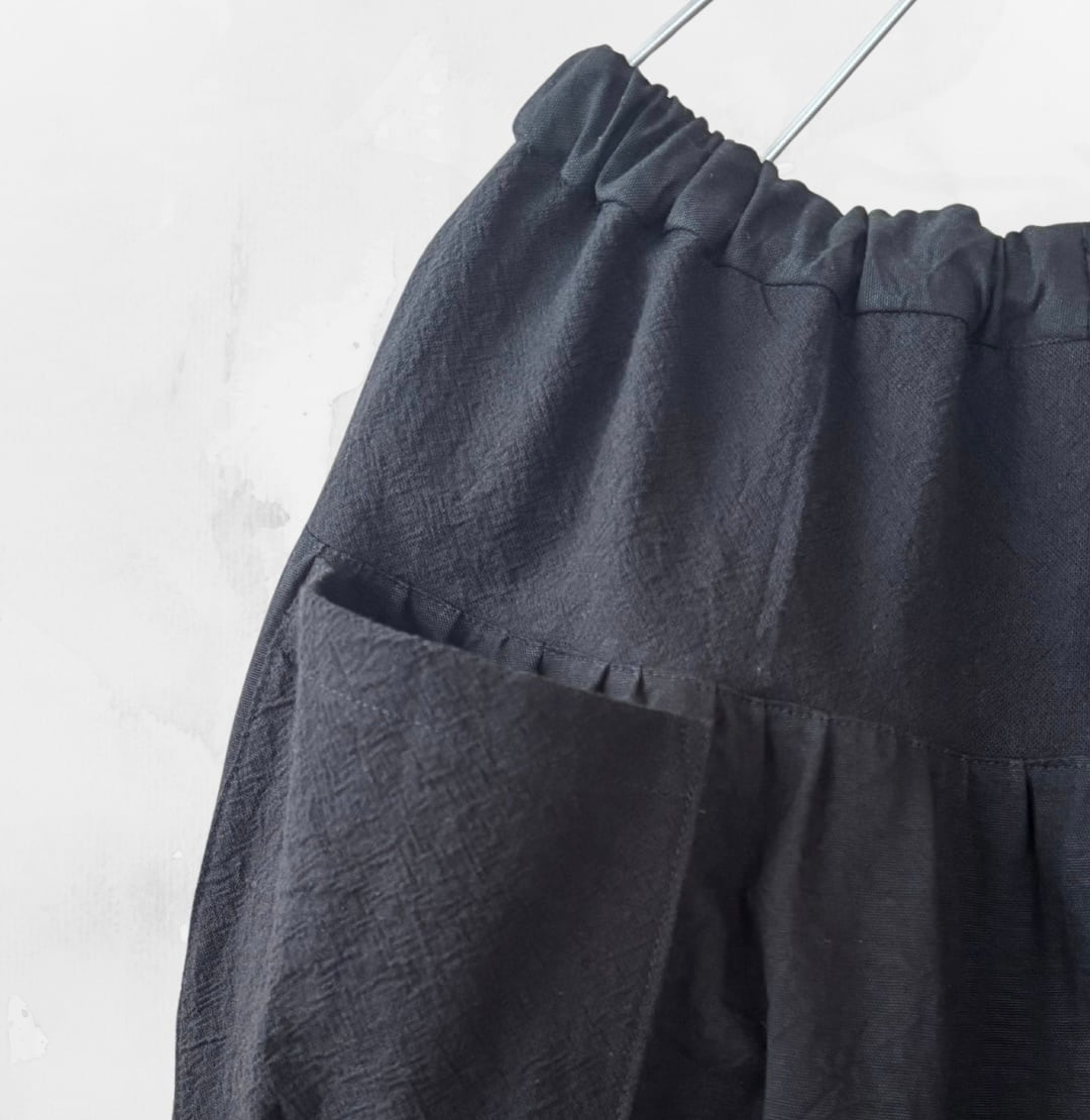 生地は綿麻ワッシャーや綿ドビークロス、綿ビンテージオックスなど2〜3種類のブラックコットンを組み合わせております。