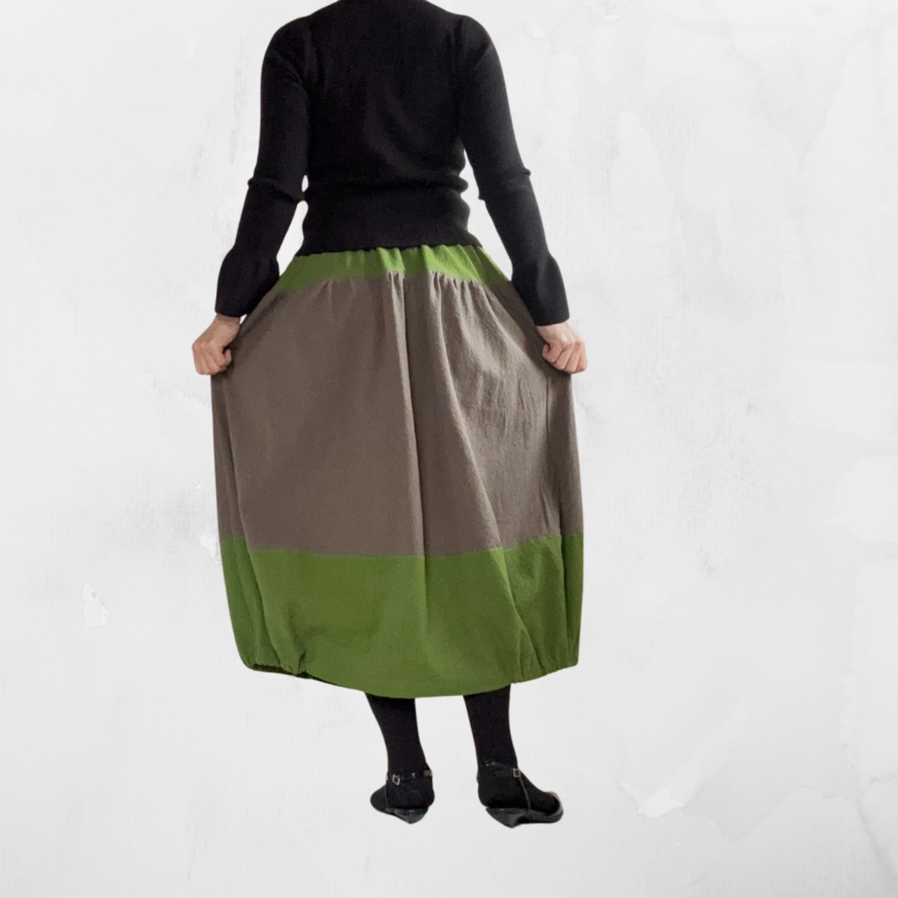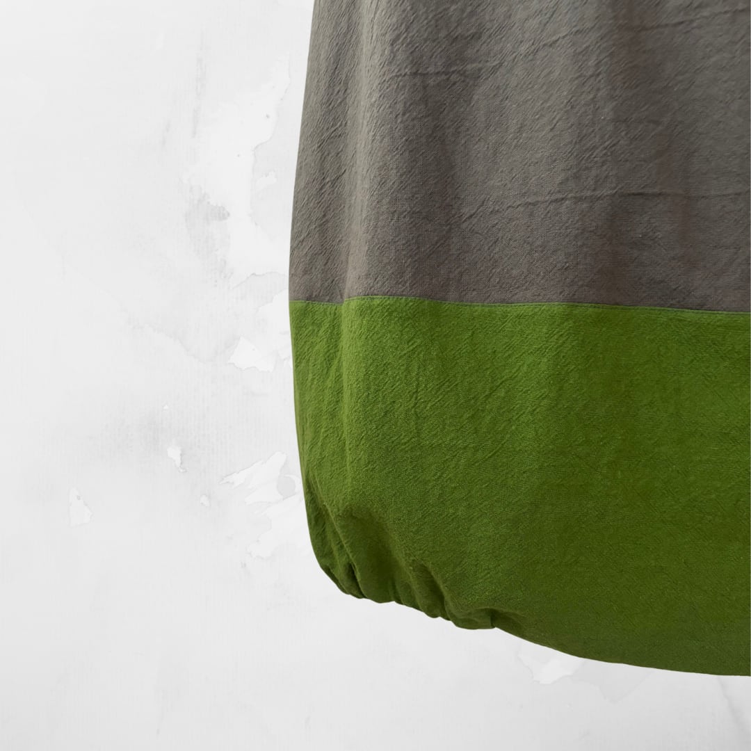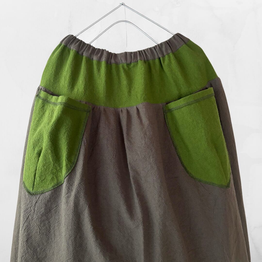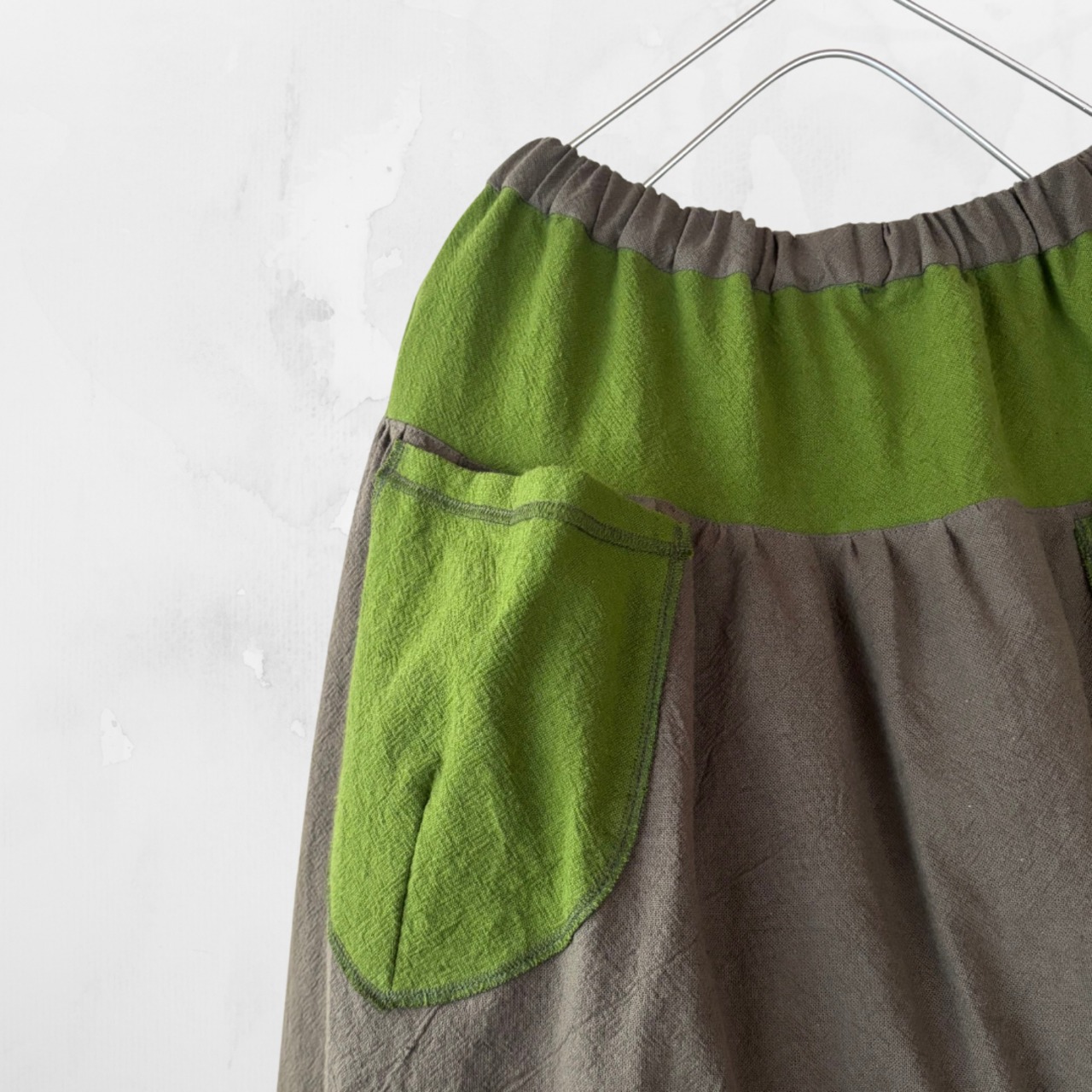 自然でやさしい風合いの先染めワッシャーコットン。アースグリーンと組み合わせました。