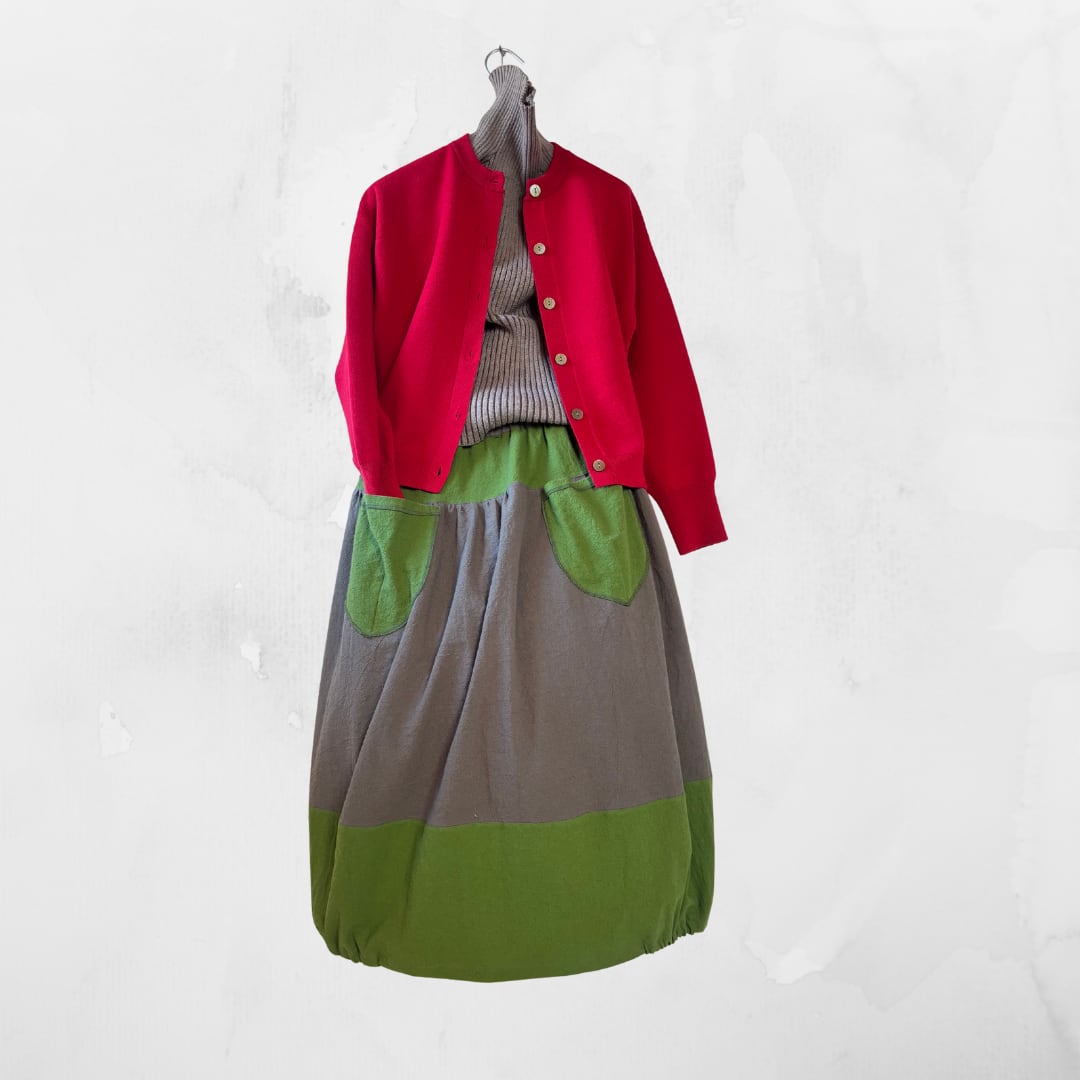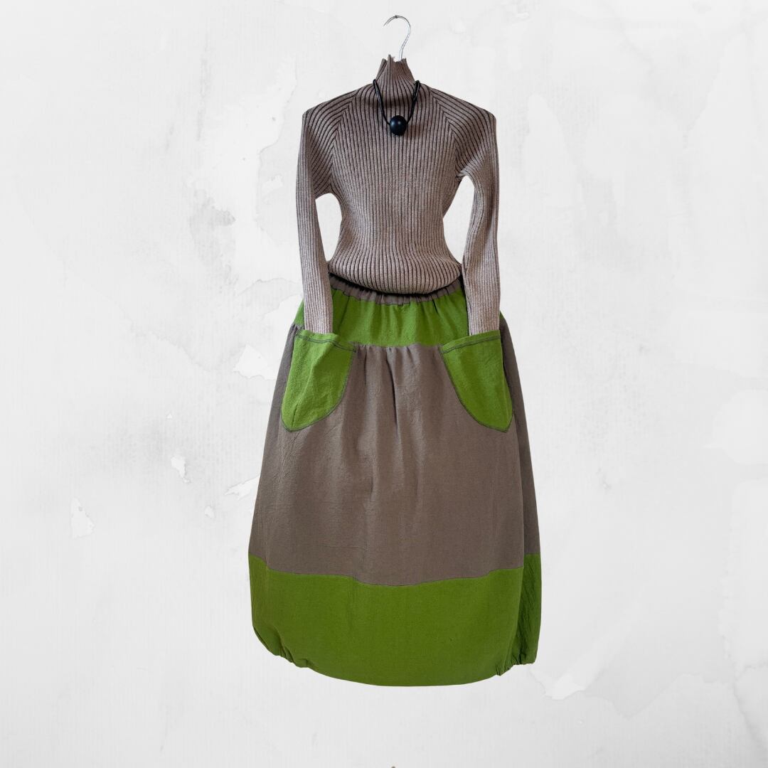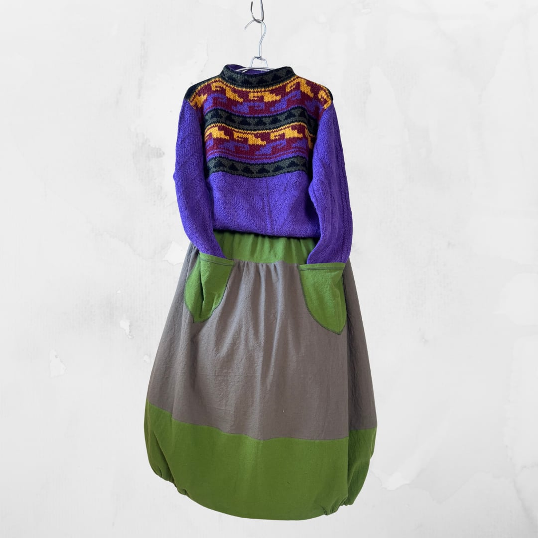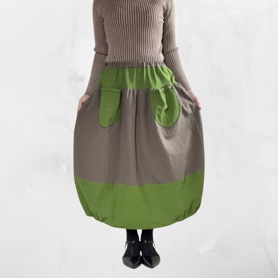 自然でやさしい風合いの先染めワッシャーコットン。アースグリーンと組み合わせました。