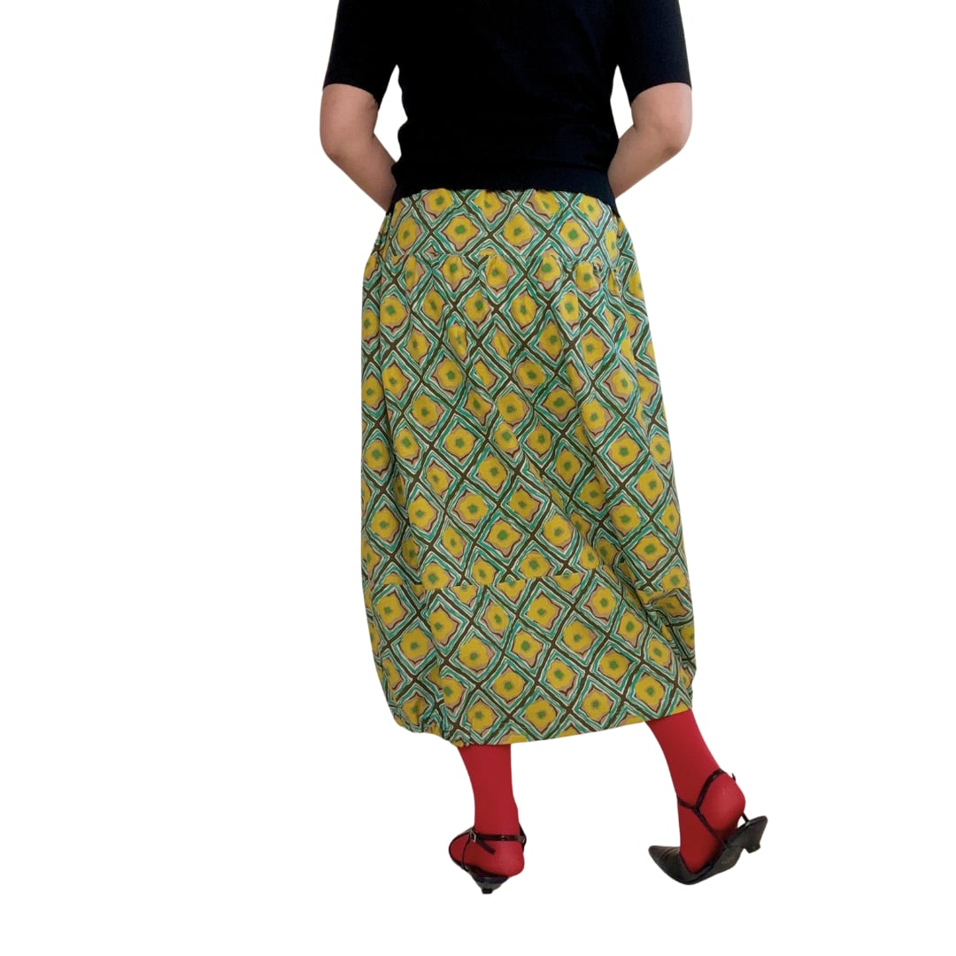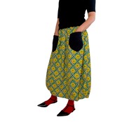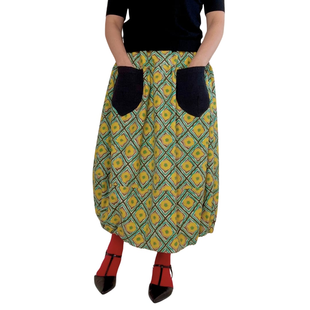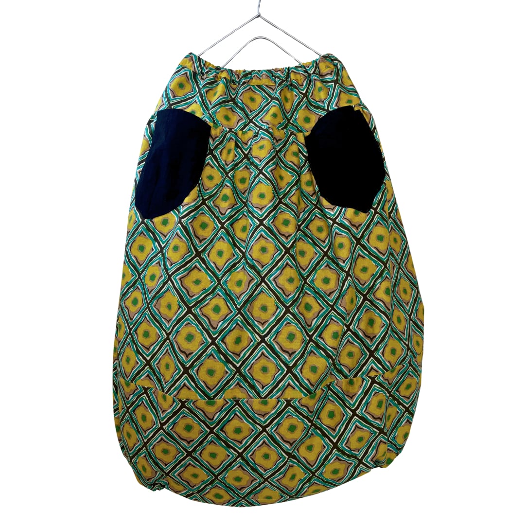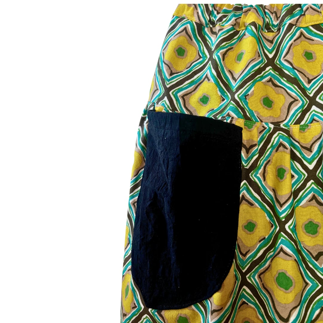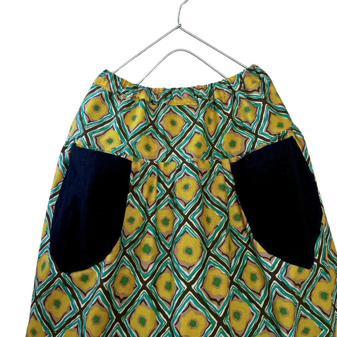 イエロー綿麻菱形ダマスク ポケットブラックのスカート